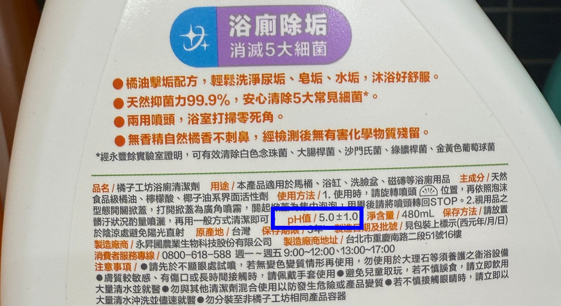 - 查看產品包裝背面標示,確認pH 值是否介於5~9之間。