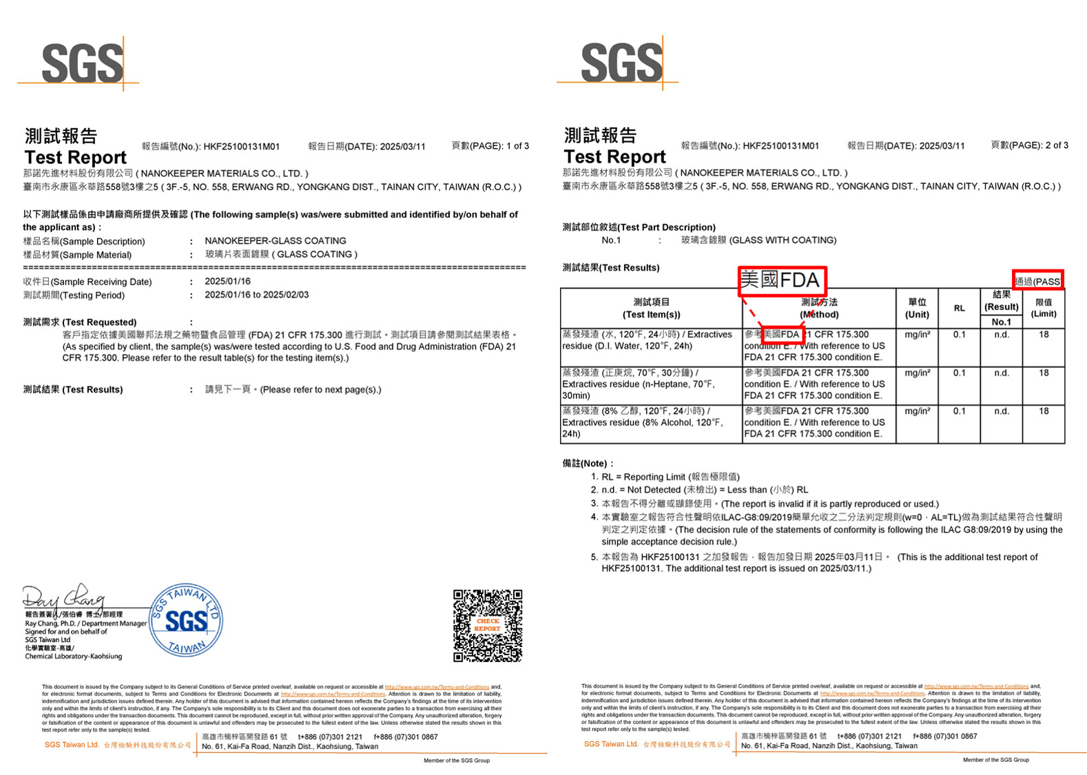 SGS 檢驗NANOKEEPER專業鍍膜液通過FDA檢驗