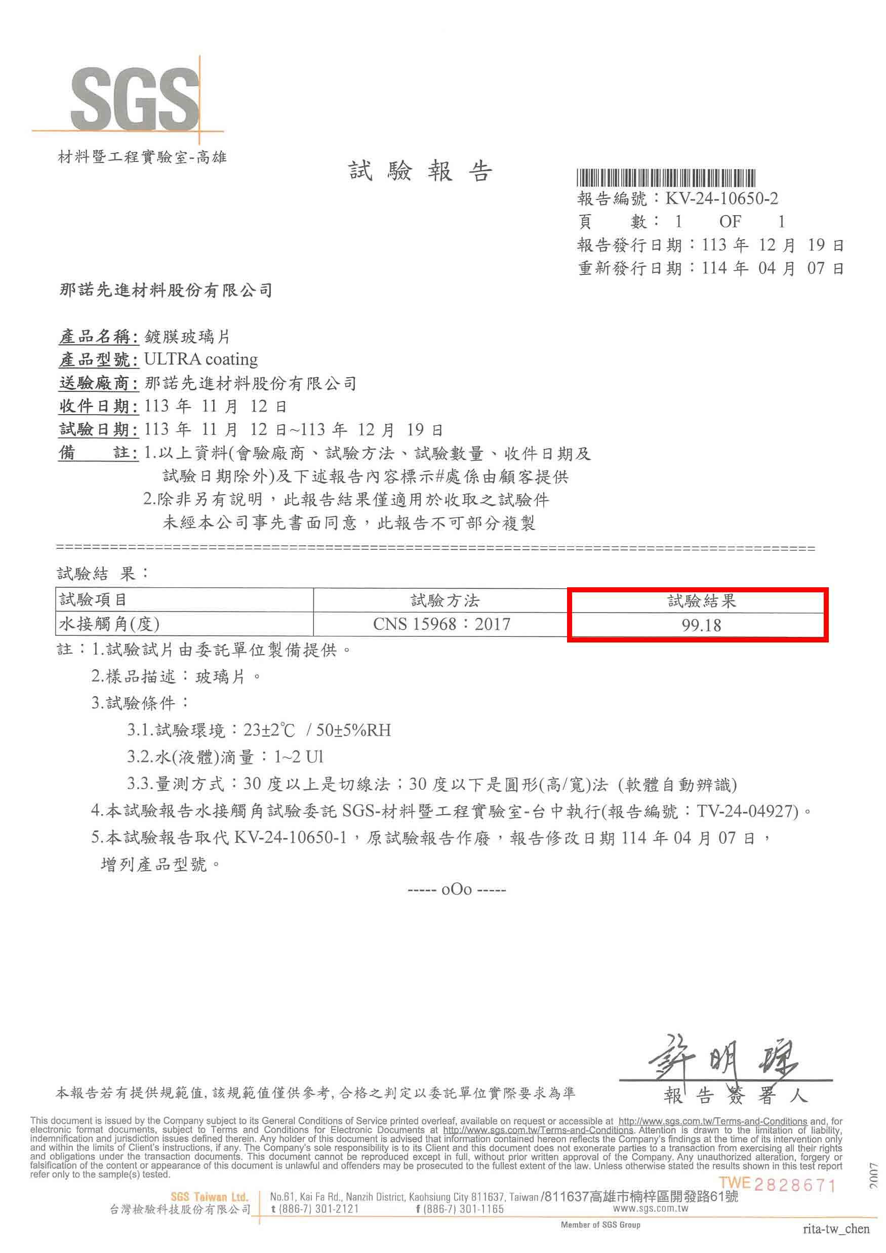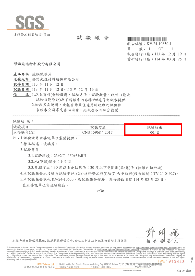 NANOKEEPER專業鍍膜液,通過SGS 撥水角檢驗報告