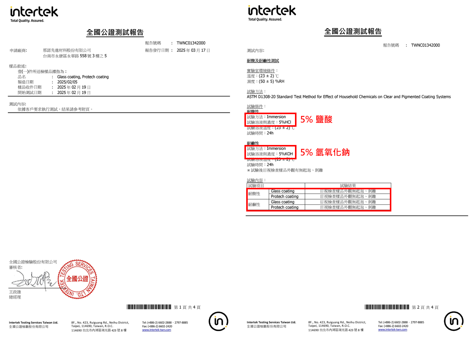 NANOKEEPER專業鍍膜液,通過intertek「耐酸鹼檢驗報告」